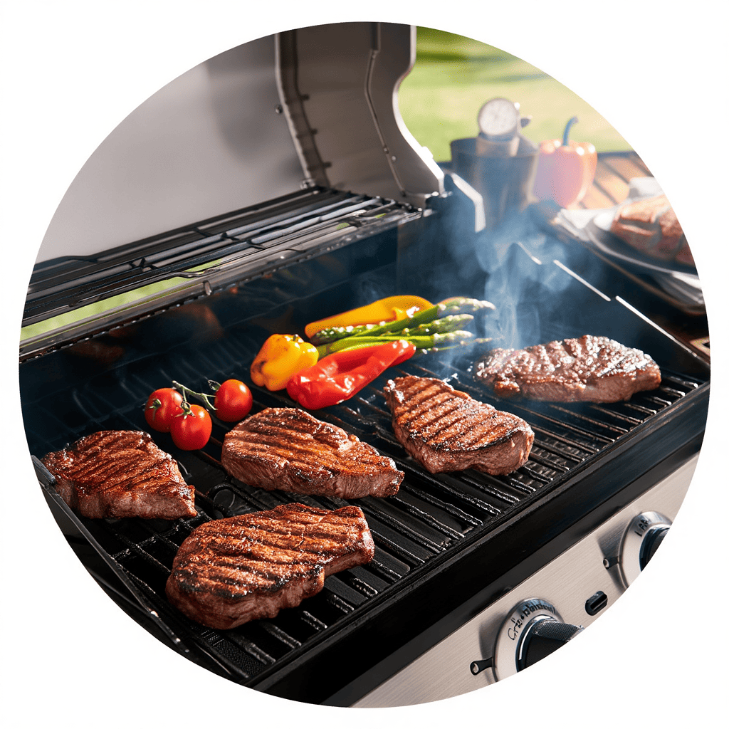 Модель создана для тех, кто любит собирать друзей и ценит стабильную работу техники. Char-Broil Performance Series™ 4B сочетает современный дизайн шкафа с высокой производительностью и удобством в эксплуатации. Благодаря системе FlavorMax™ гриль обеспечивает равномерный жар и насыщенный вкус на всей рабочей поверхности площадью 435 кв. дюймов (около 2800 см²) — этого достаточно, чтобы приготовить до 25 бургеров одновременно.